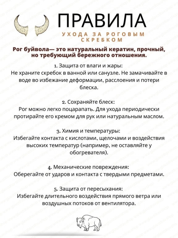 2. Сохраняйте блеск: Рог можно легко поцарапать. Для ухода периодически протирайте его кремом для рук или натуральным маслом.